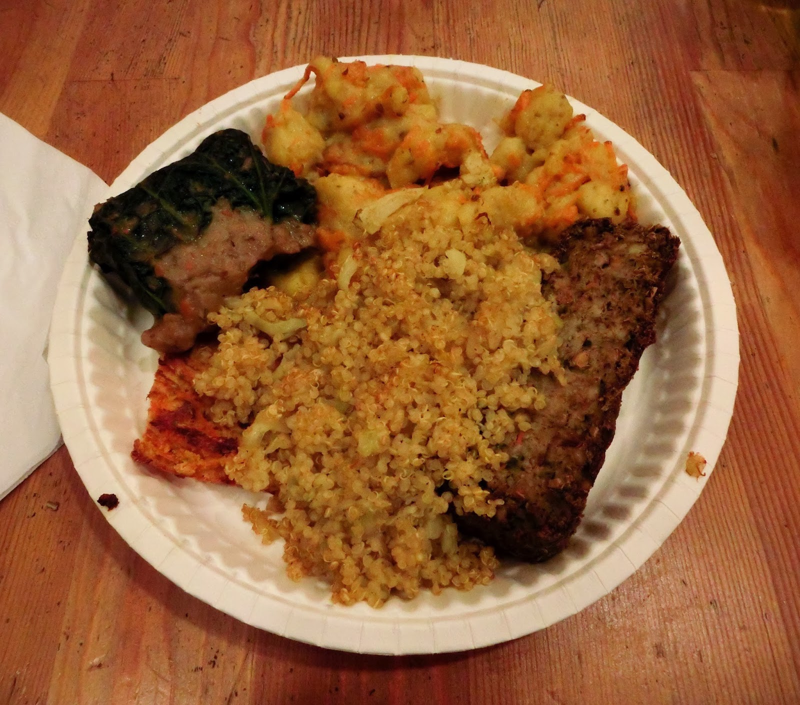 Hier ein Stück veganer Braten, Gnocchi, eine Kohlroulade, Quinoa und ein Gemüsebratling. TOLL!